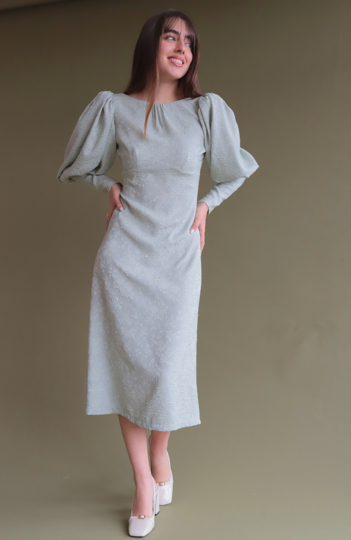 Nuestro Clara Dress es un vestido definido en la cintura y con una caída ligera. Su detalle principal son las mangas abullonadas, con gran volumen, que aportan movimiento y un aire romántico al diseño. El corte en la parte superior ayuda a resaltar la silueta.
