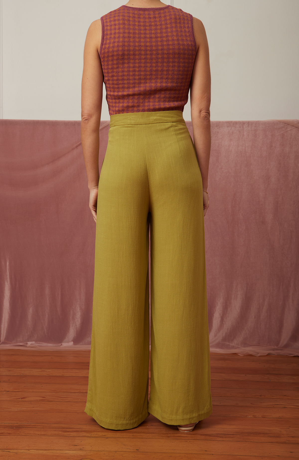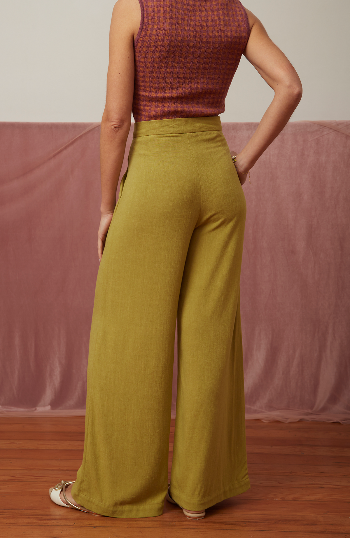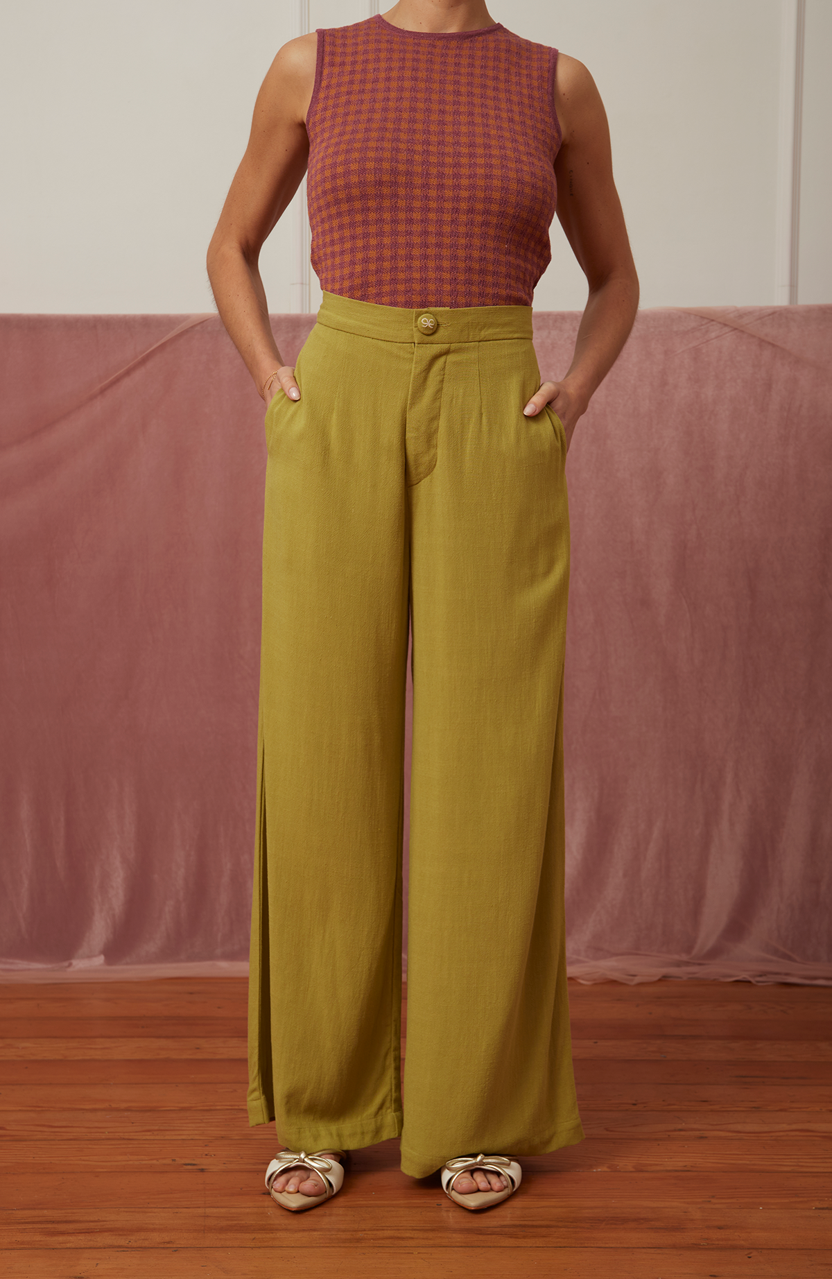 El pantalón Garden está confeccionado en lino 100%, una fibra natural que respira elegancia y frescura. De pierna ancha y cintura alta, su caída fluida realza la silueta con un aire ligero y atemporal.