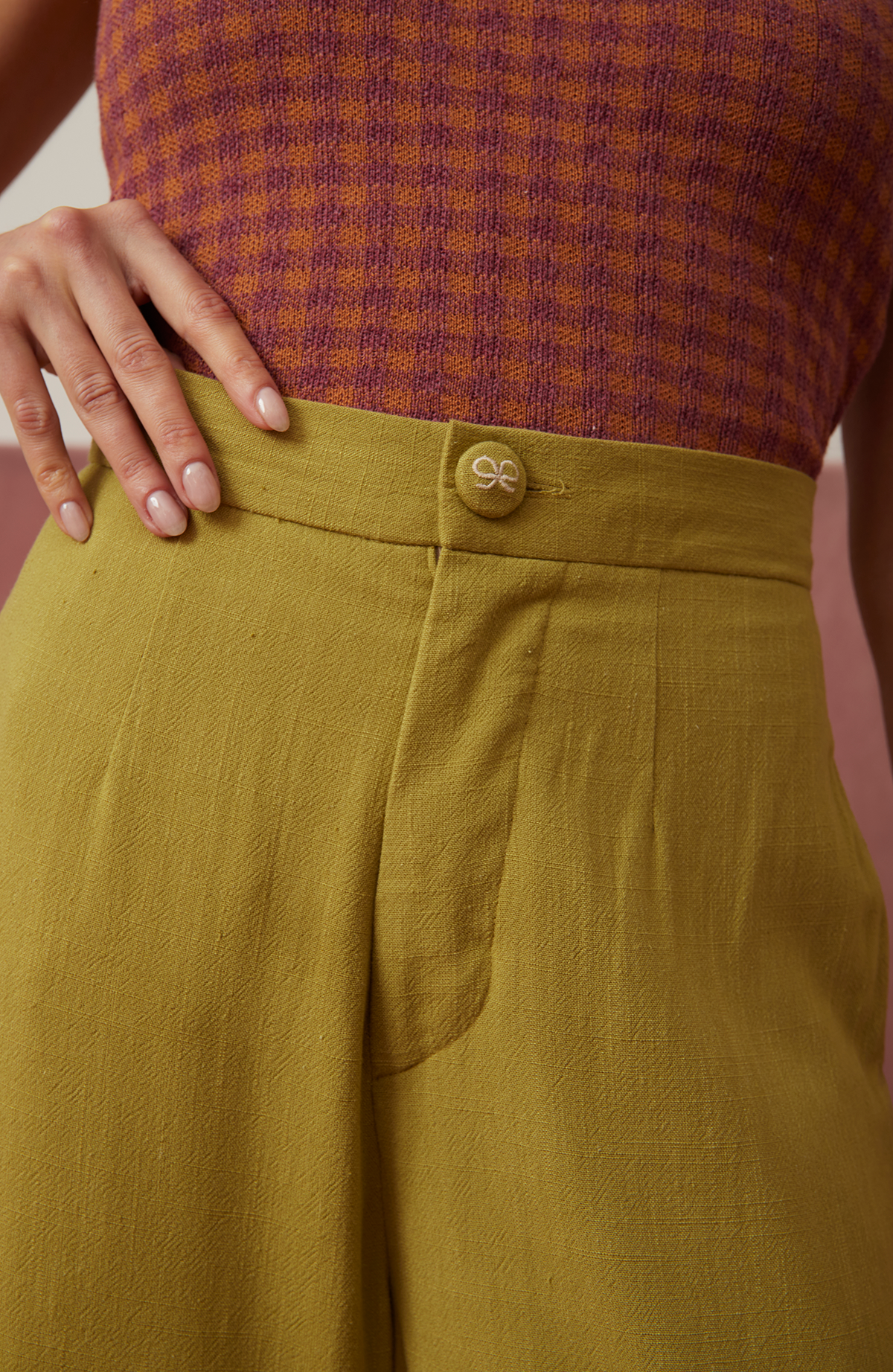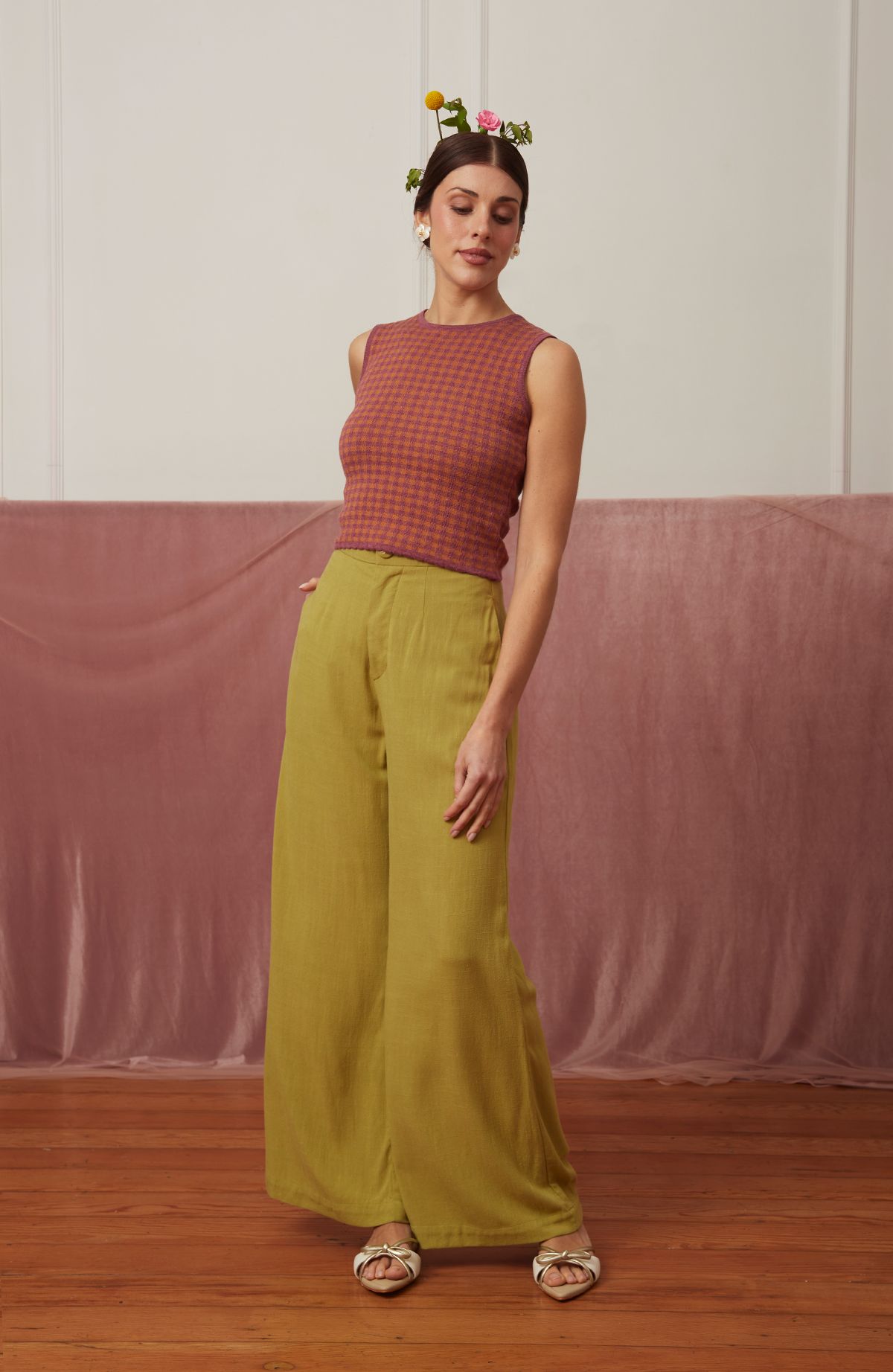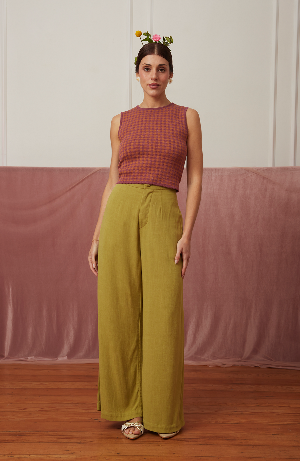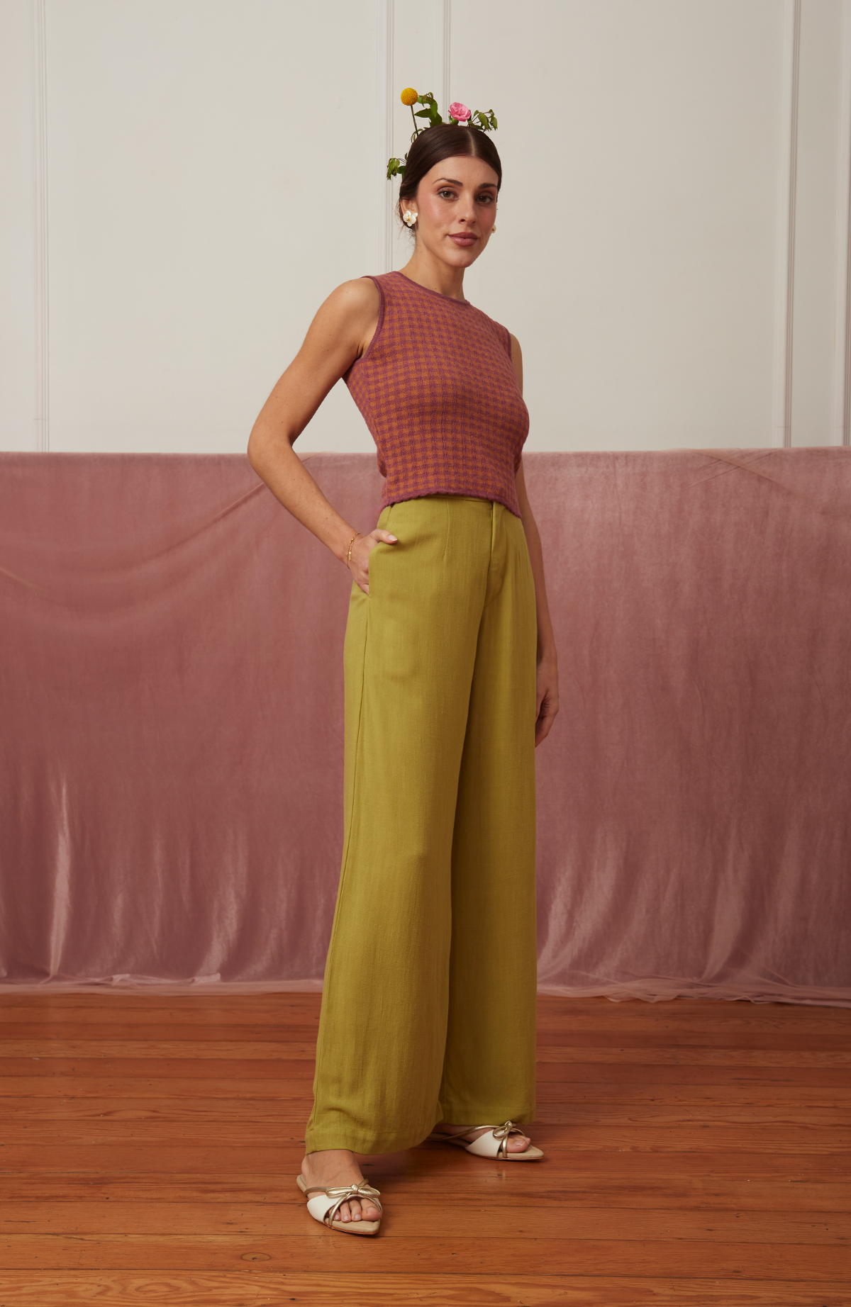 El pantalón Garden está confeccionado en lino 100%, una fibra natural que respira elegancia y frescura. De pierna ancha y cintura alta, su caída fluida realza la silueta con un aire ligero y atemporal.