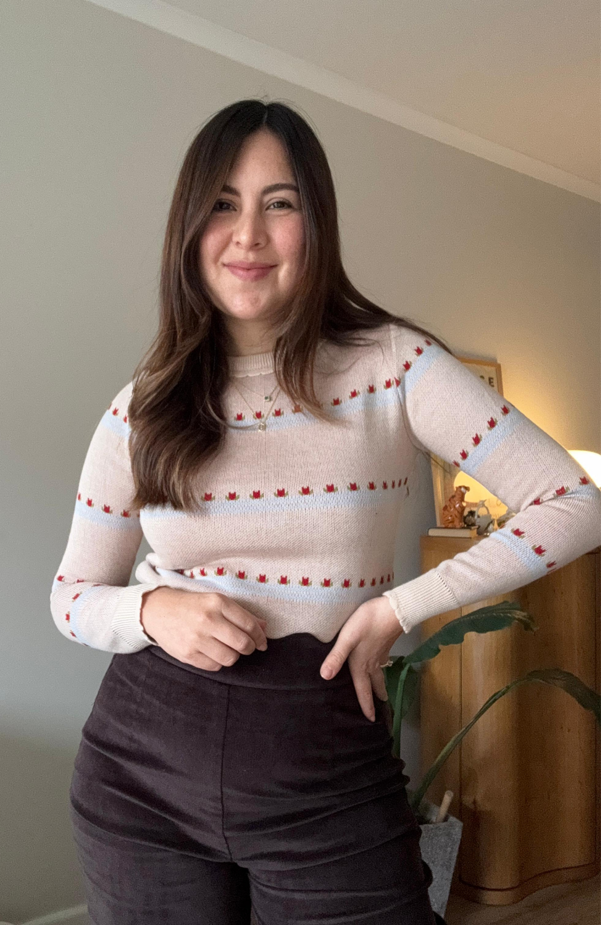 Sweater tejido en técnica de jacquard con líneas horizontales y pequeños detalles de flores distribuidas a lo largo de la prenda. El diseño incluye delicados scallops alrededor del cuello y en los puños de las mangas. Su tejido suave y el fit relajado hacen de esta prenda una opción cómoda y femenina, ideal para el uso diario.