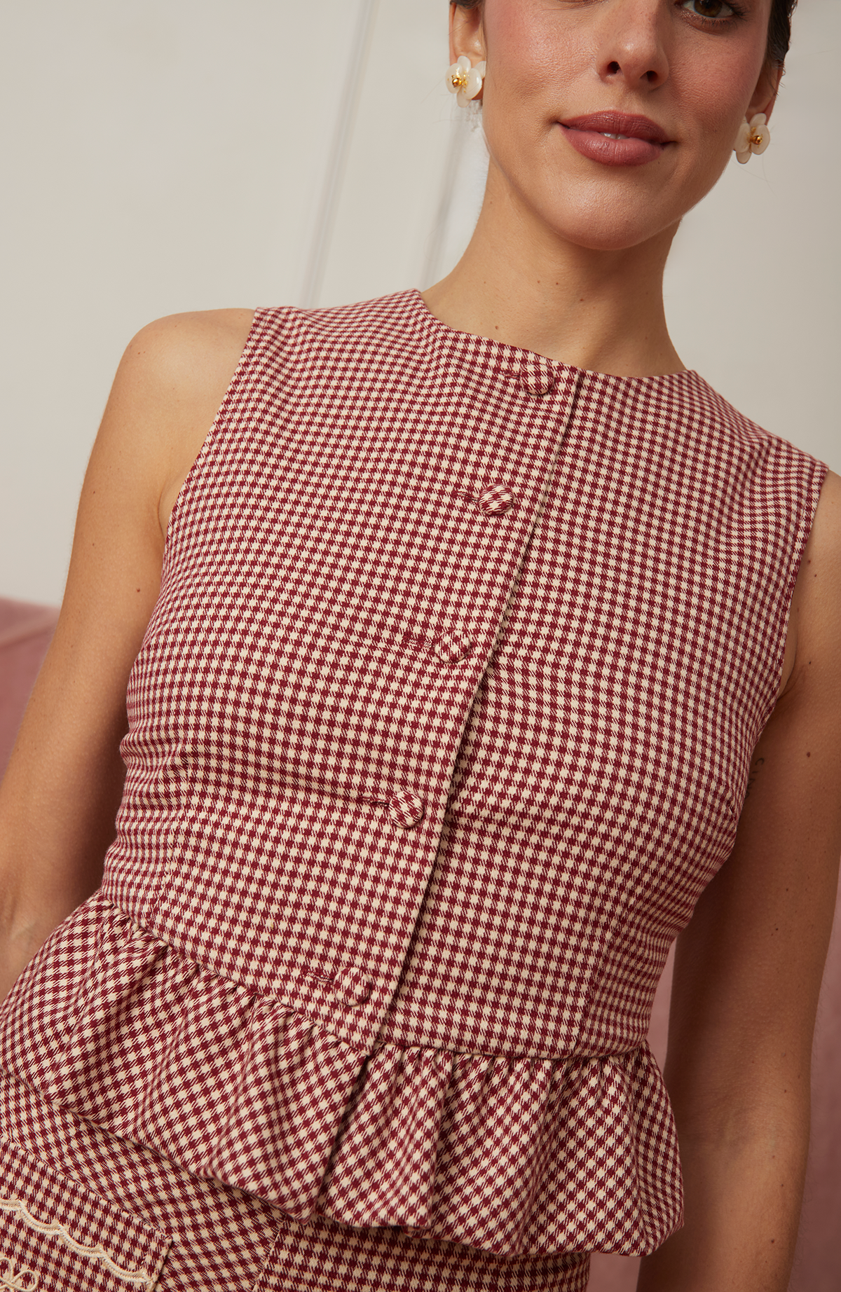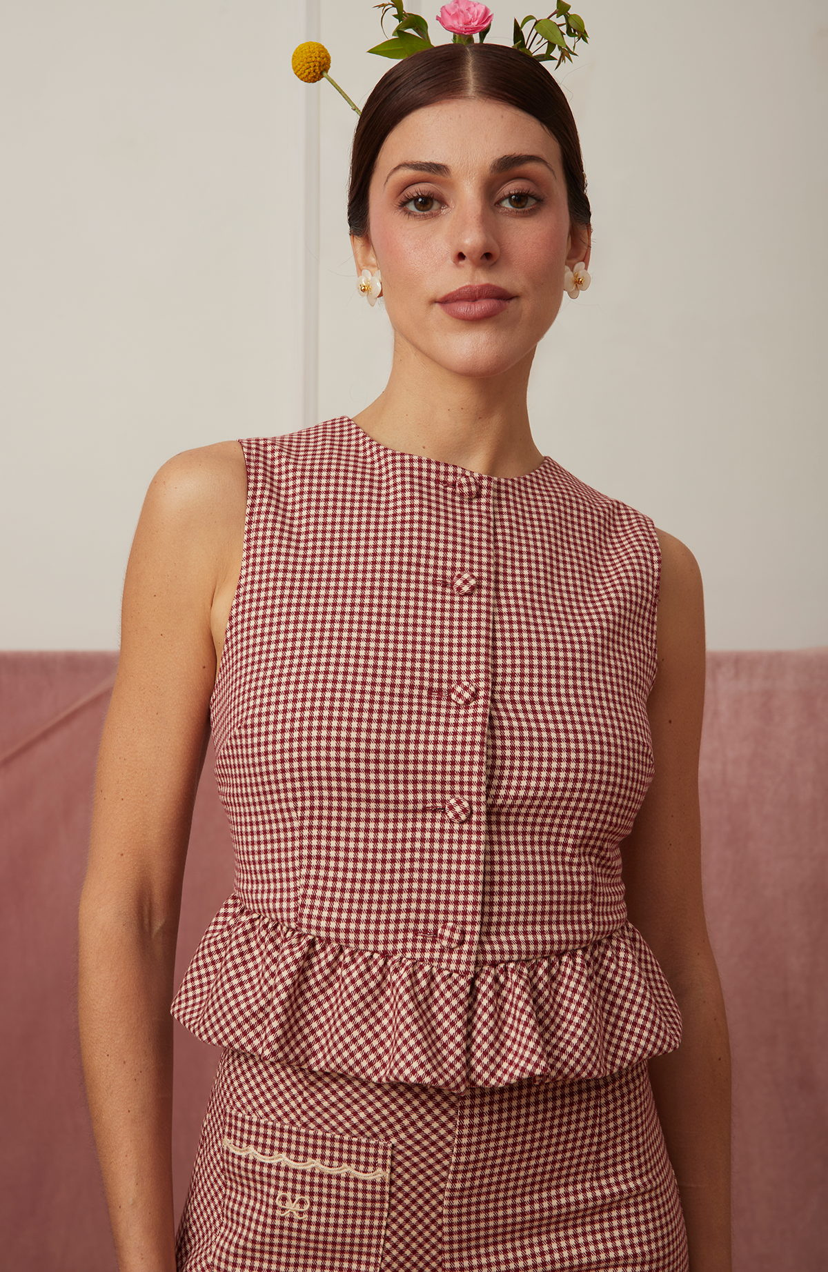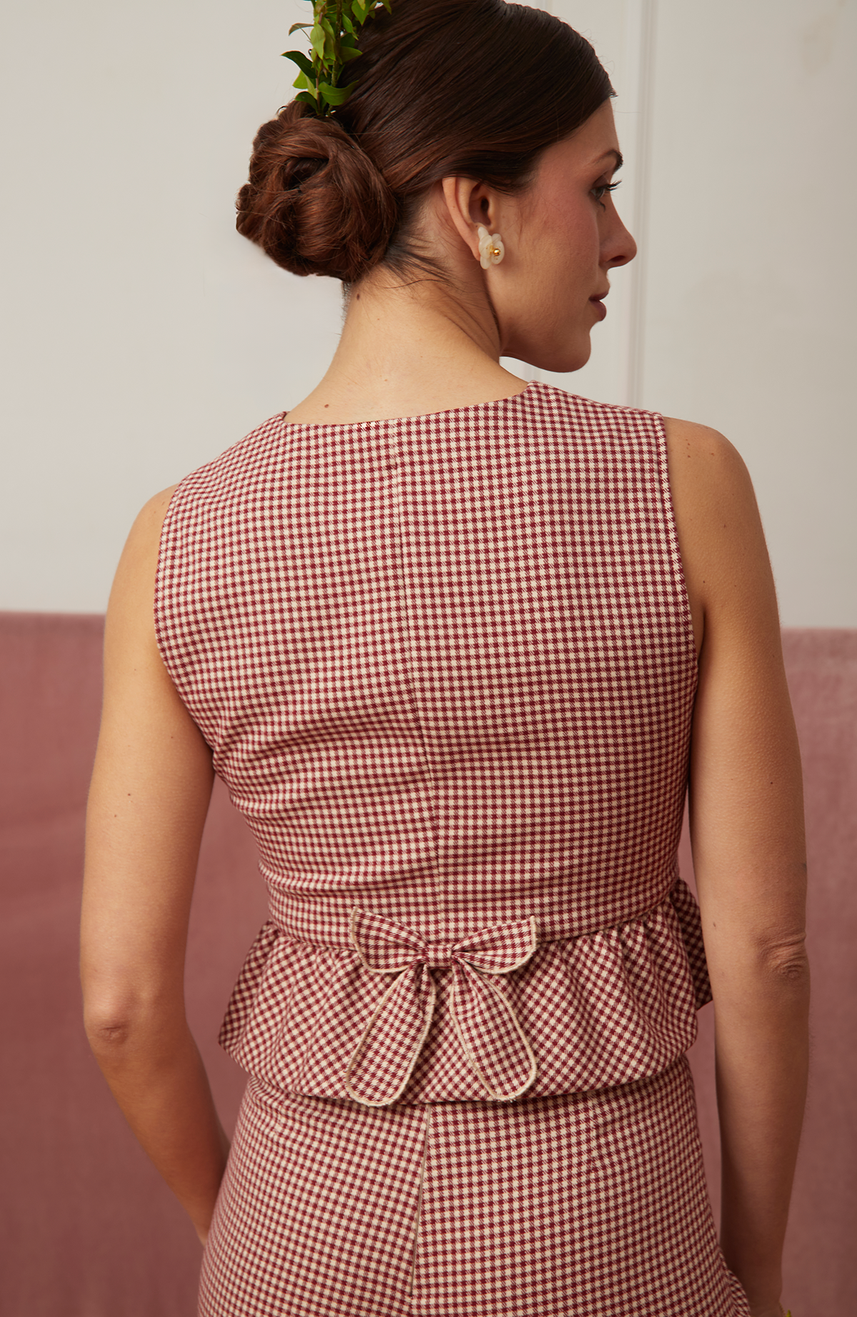 El Top Prado es una pieza de aire sartorial y encanto atemporal que combina estructura y delicadeza. Su silueta sin mangas con botones forrados al frente realza la figura con un entalle sutil en la cintura y un pequeño volante fruncido que aporta un toque romántico. En la parte posterior, un lazo delicado completa el diseño, convirtiéndolo en un top versátil que puede acompañarte tanto en un look casual de día como en uno más elegante junto a pantalones de la colección.