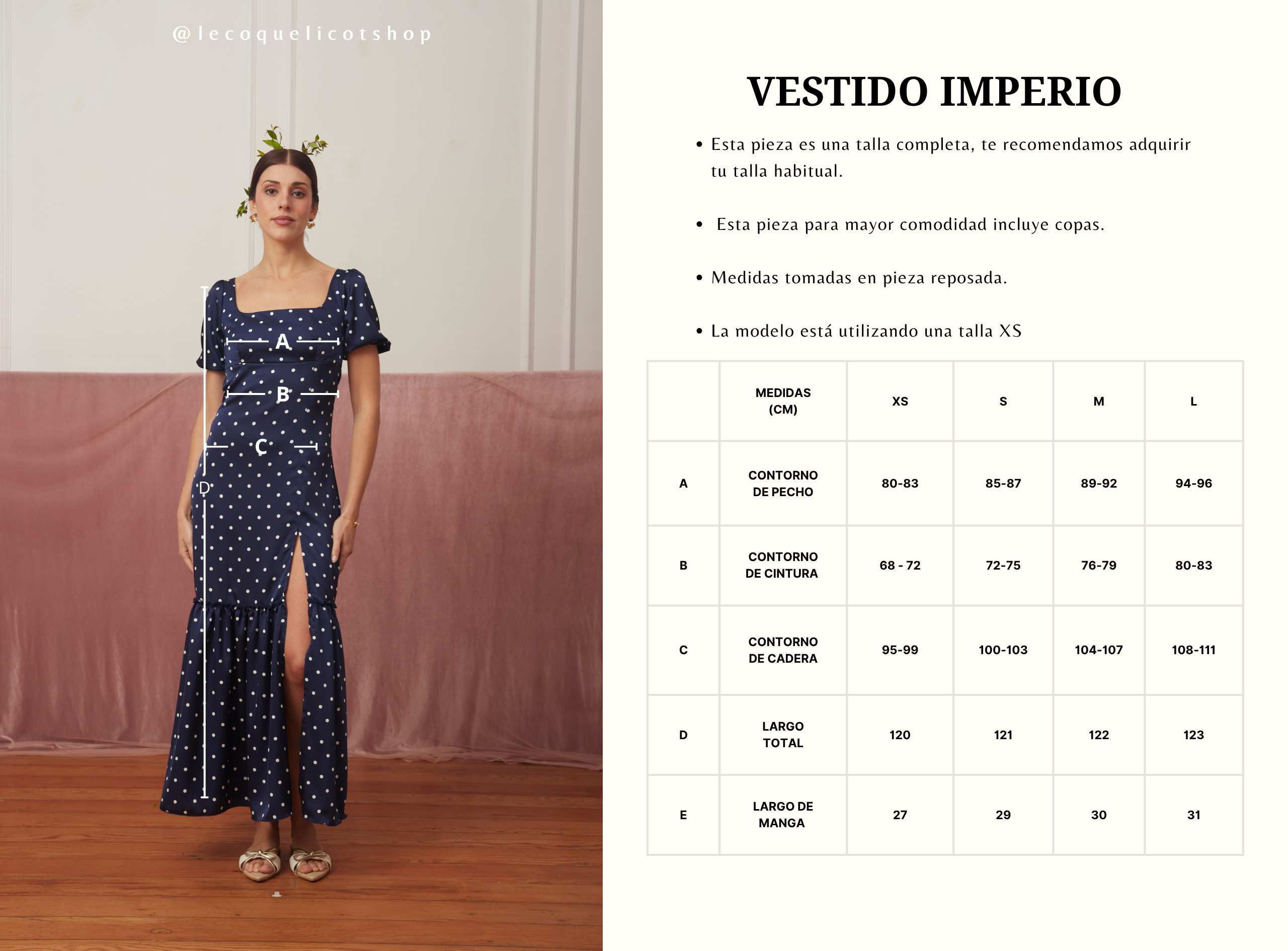 El favorito vestido imperio regresa en una tela polka dots. Tiene un escote imperio recto, con mangas cortas abullonadas. Con una pieza fruncida en la falda, y abertura en la pierna izquierda. Además lleva un cierre invisible en la espalda, a tono del vestido.