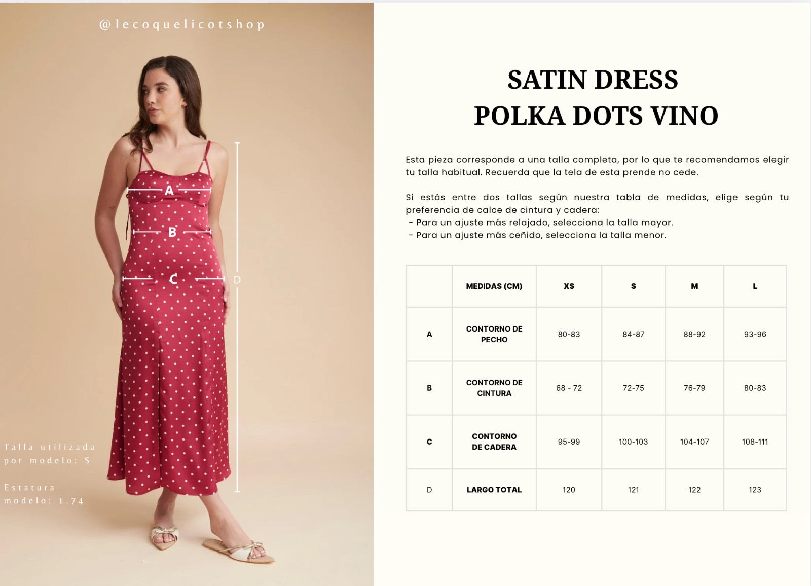 Our best seller from the Holiday collection returns. Made with a delicious satin with an incredible drape and perfect softness, in a cherry color with white polka dots. It has a cut close to the body up to the hips, the entire hem of the skirt has a special fall because it has built-in godets. It also has an opening in the leg, and an invisible zipper on the side. On the back, it has two adjustable straps that are intertwined from the front and end in the shape of a bow, which you can adjust to suit you.