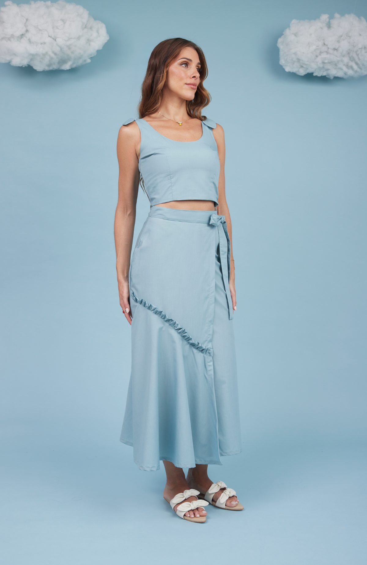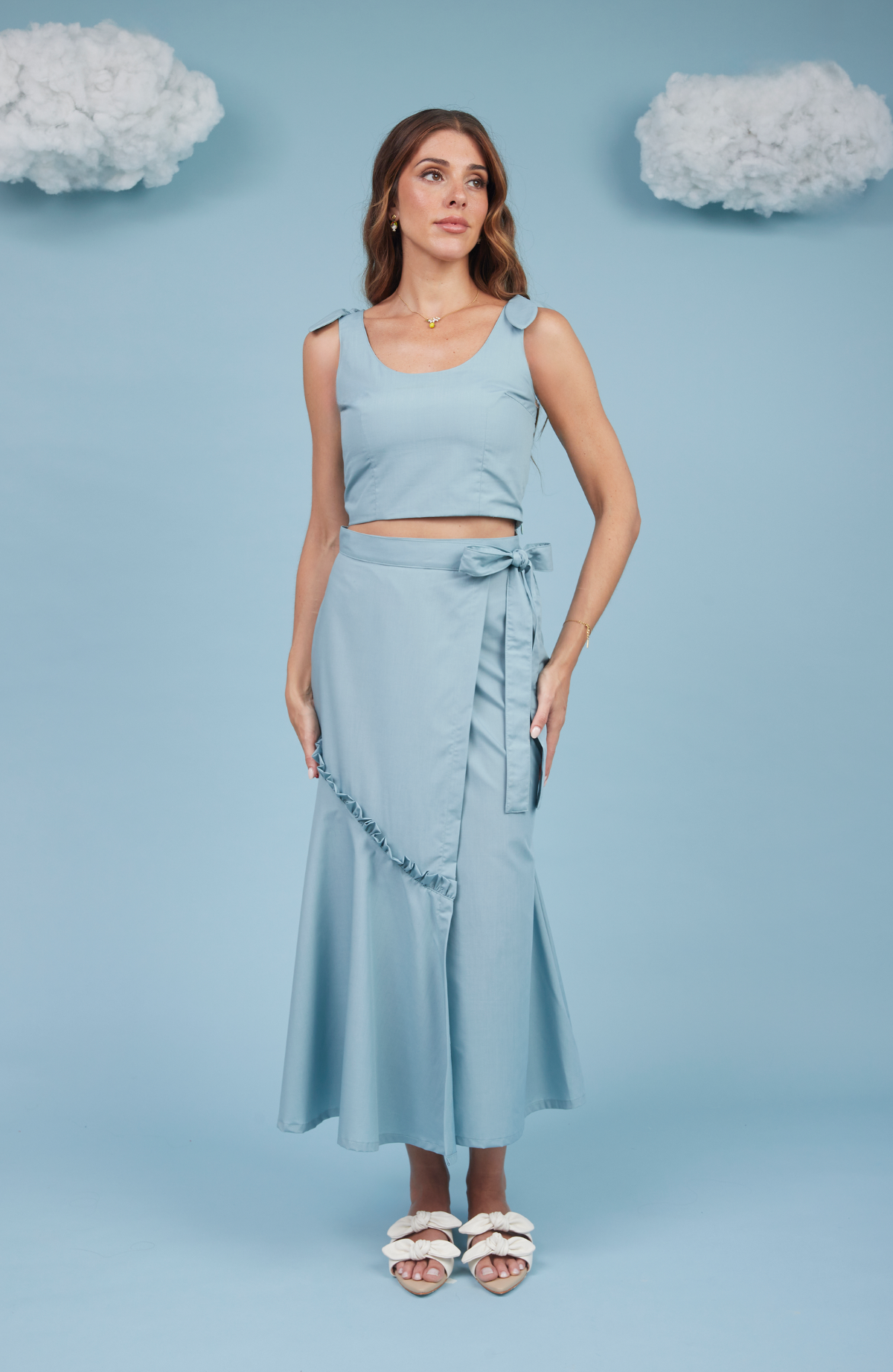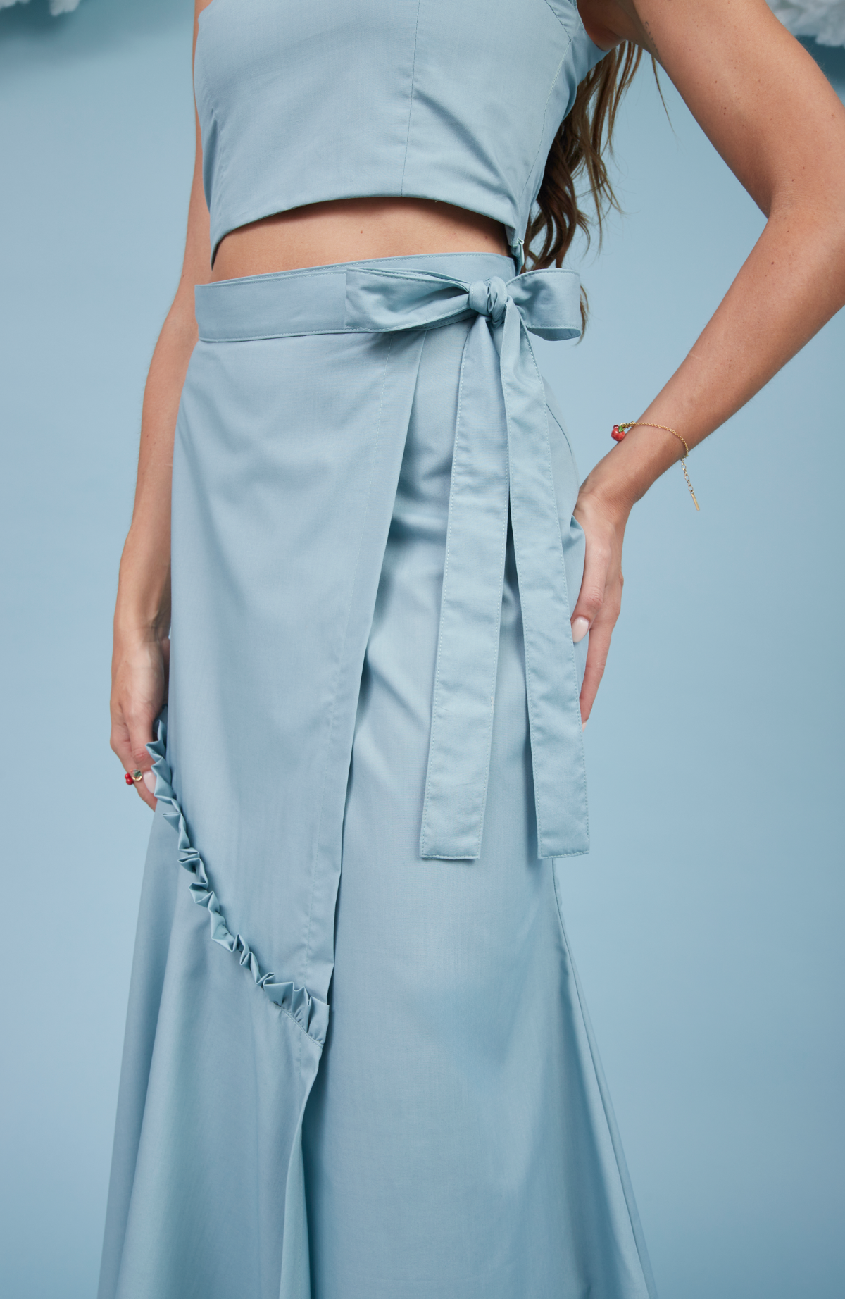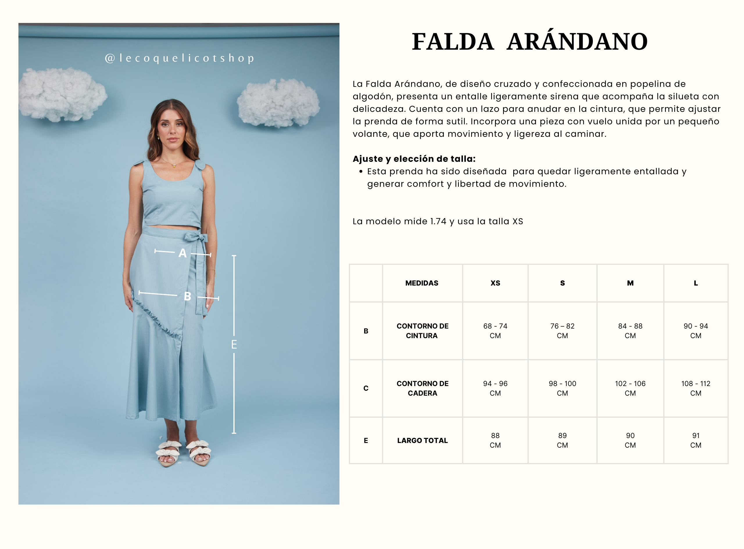 La Falda Arándano, de diseño cruzado y confeccionada en popelina de algodón, presenta un entalle ligeramente sirena que acompaña la silueta con delicadeza. Cuenta con un lazo para anudar en la cintura, que permite ajustar la prenda de forma sutil. Incorpora una pieza con vuelo unida por un pequeño volante, que aporta movimiento y ligereza al caminar.
