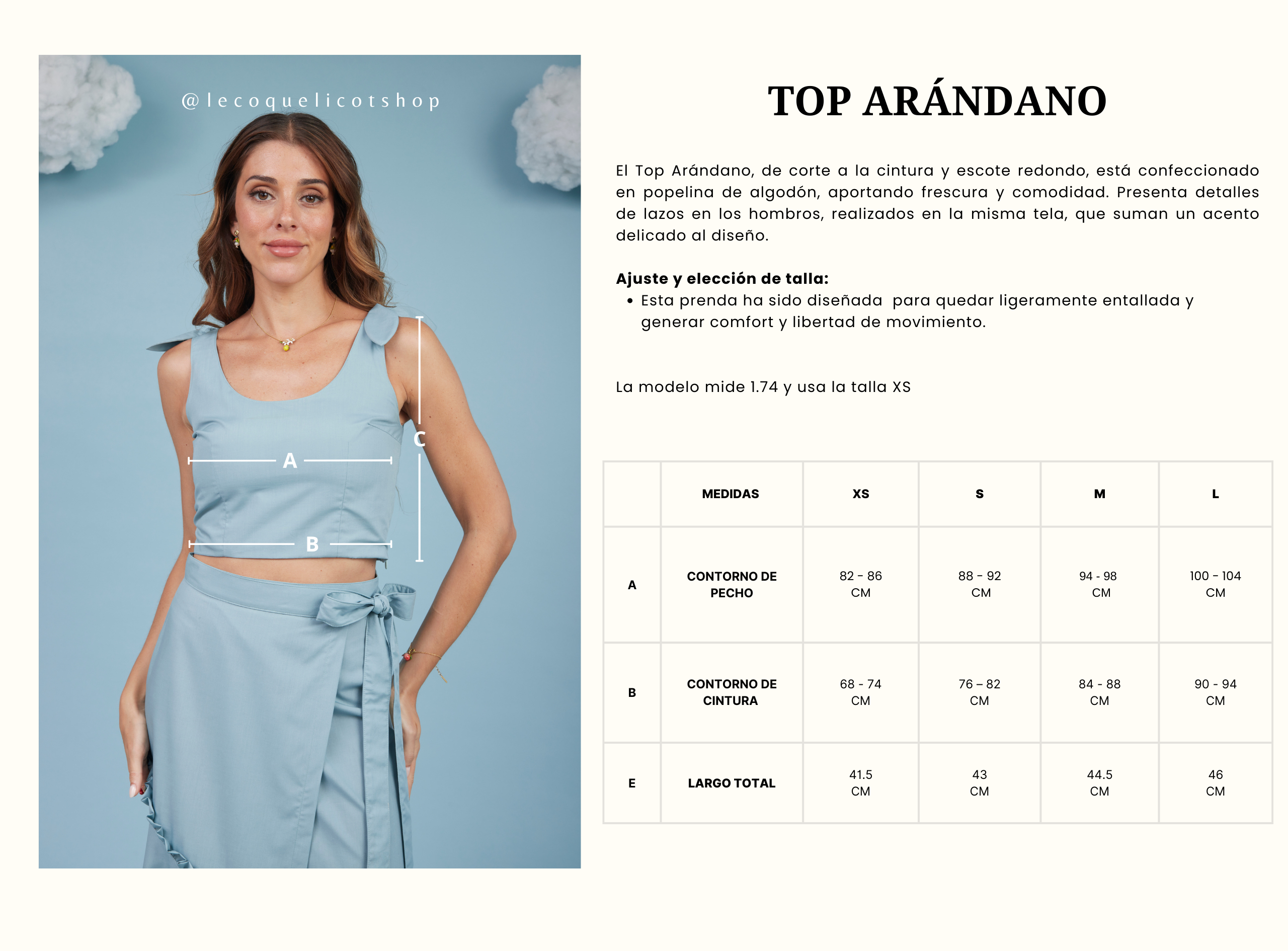 El Top Arándano, de corte a la cintura y escote redondo, está confeccionado en popelina de algodón, aportando frescura y comodidad. Presenta detalles de lazos en los hombros, realizados en la misma tela, que suman un acento delicado al diseño.
