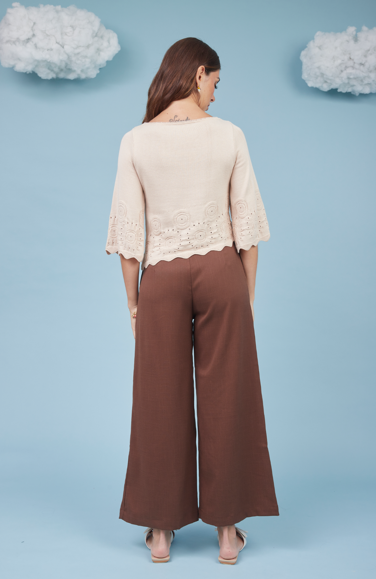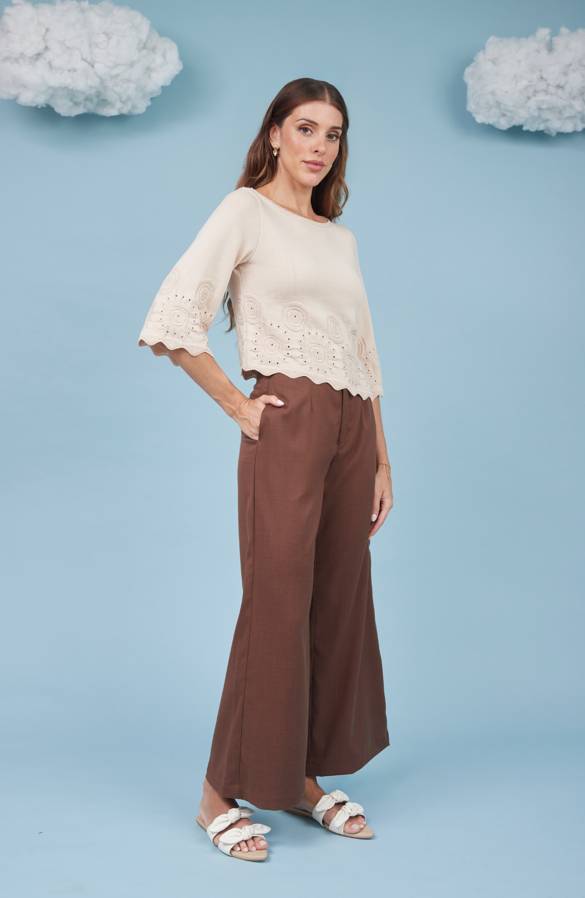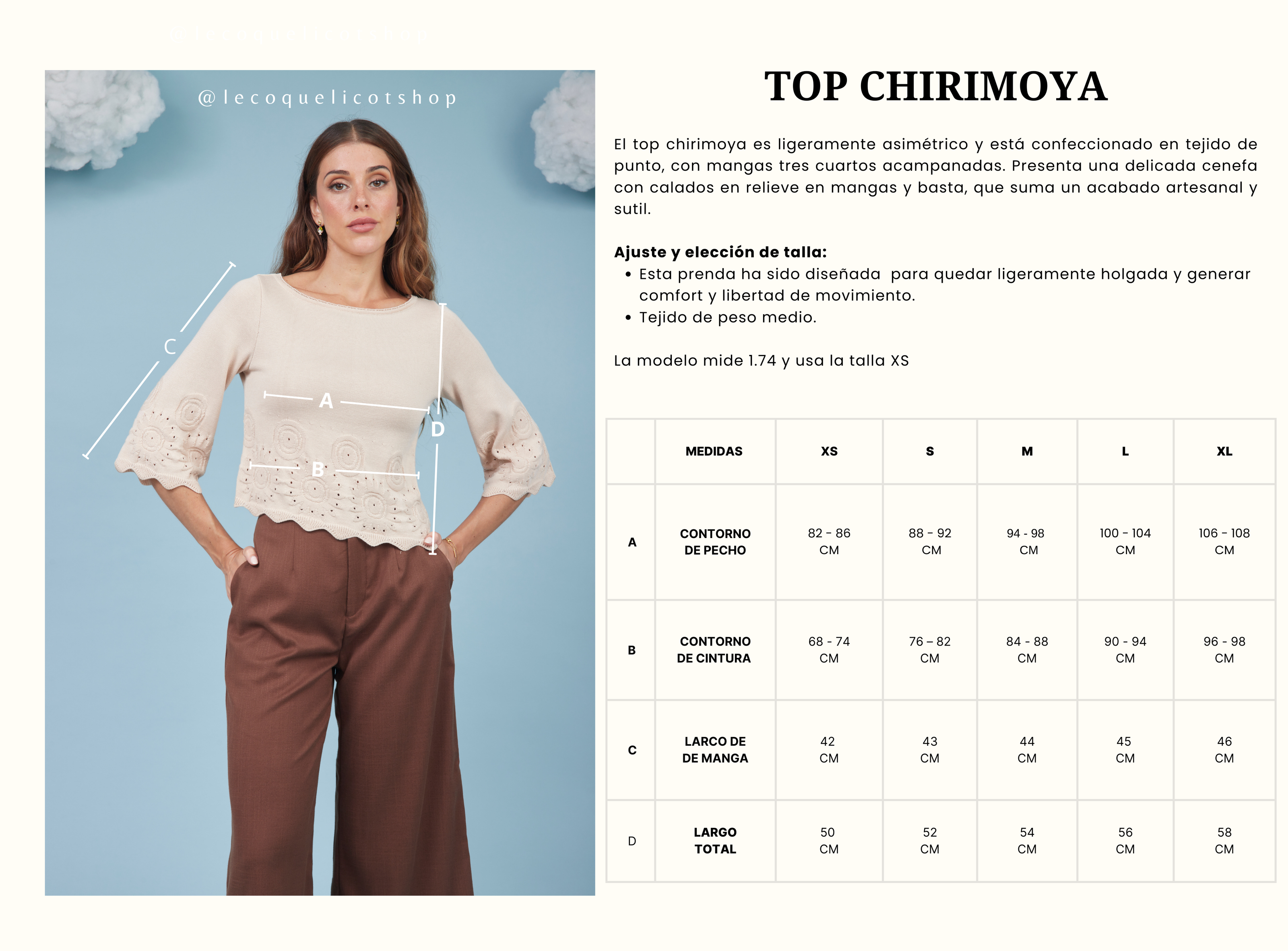 El Top Chirimoya es ligeramente asimétrico y está confeccionado en tejido de punto, con mangas tres cuartos acampanadas que aportan ligereza al diseño. Presenta una delicada cenefa con calados en relieve en mangas y basta, sumando un acabado artesanal y sutil.