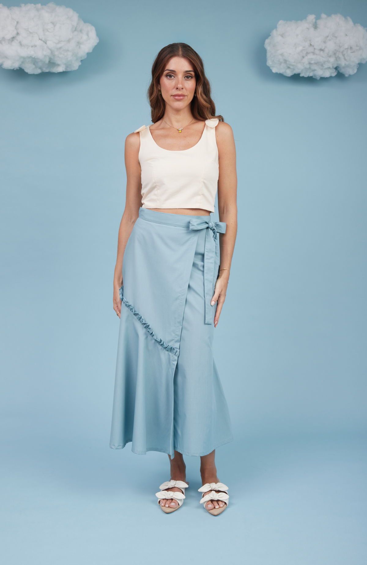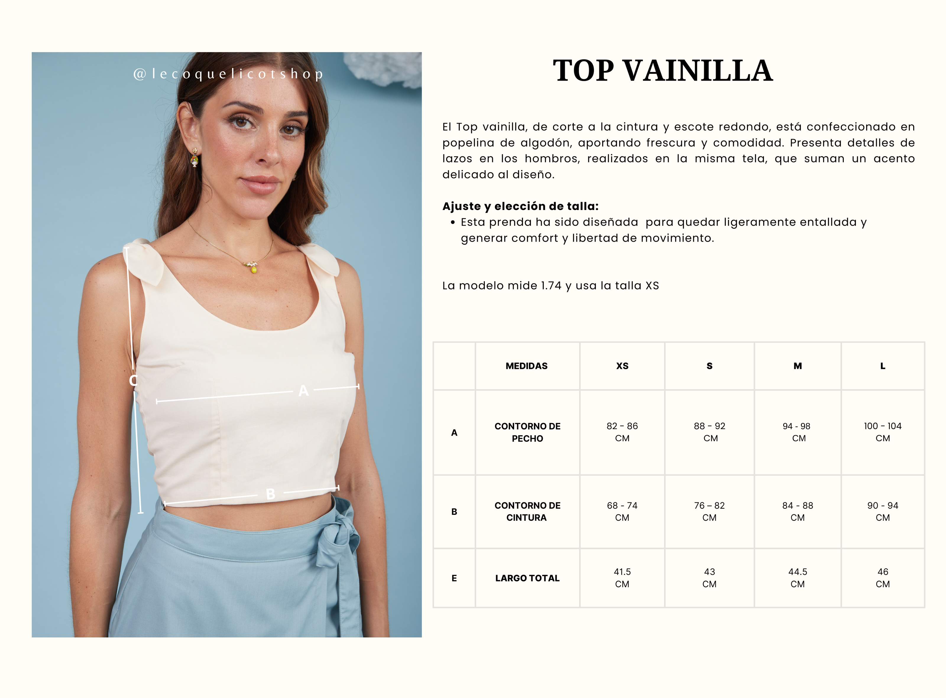 El Top vainilla, de corte a la cintura y escote redondo, está confeccionado en popelina de algodón, aportando frescura y comodidad. Presenta detalles de lazos en los hombros, realizados en la misma tela, que suman un acento delicado al diseño.