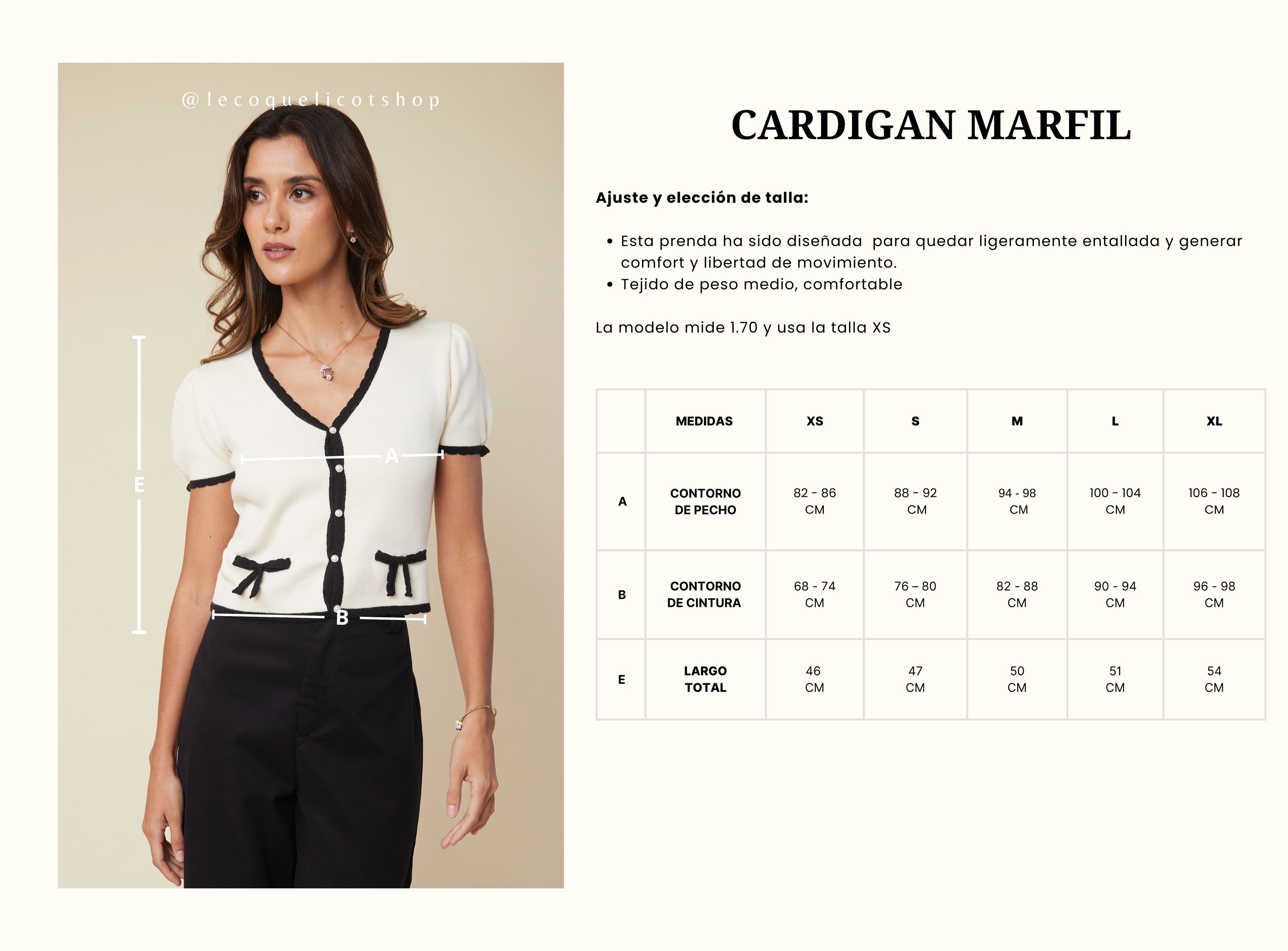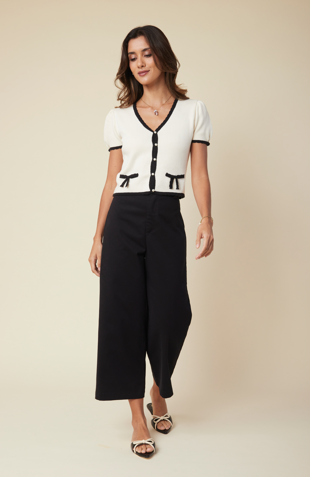 El cardigan Marfil con escote en V en color hueso, tiene detalles de scallops en negro y lacitos que simulan bolsillos.