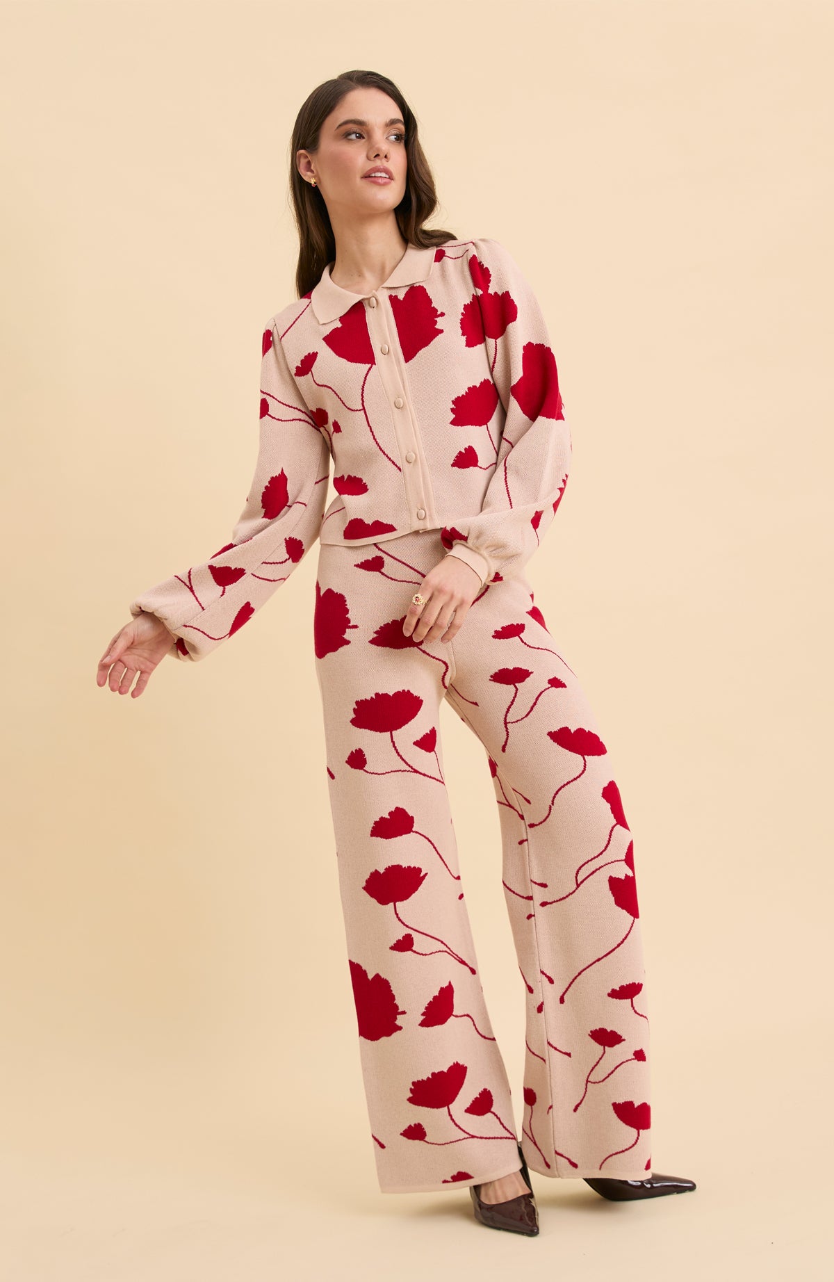 Pantalón tejido con diseño de amapolas, elaborado en un hilado suave en técnica jacquard. Cuenta con pretina ajustada a la cintura.